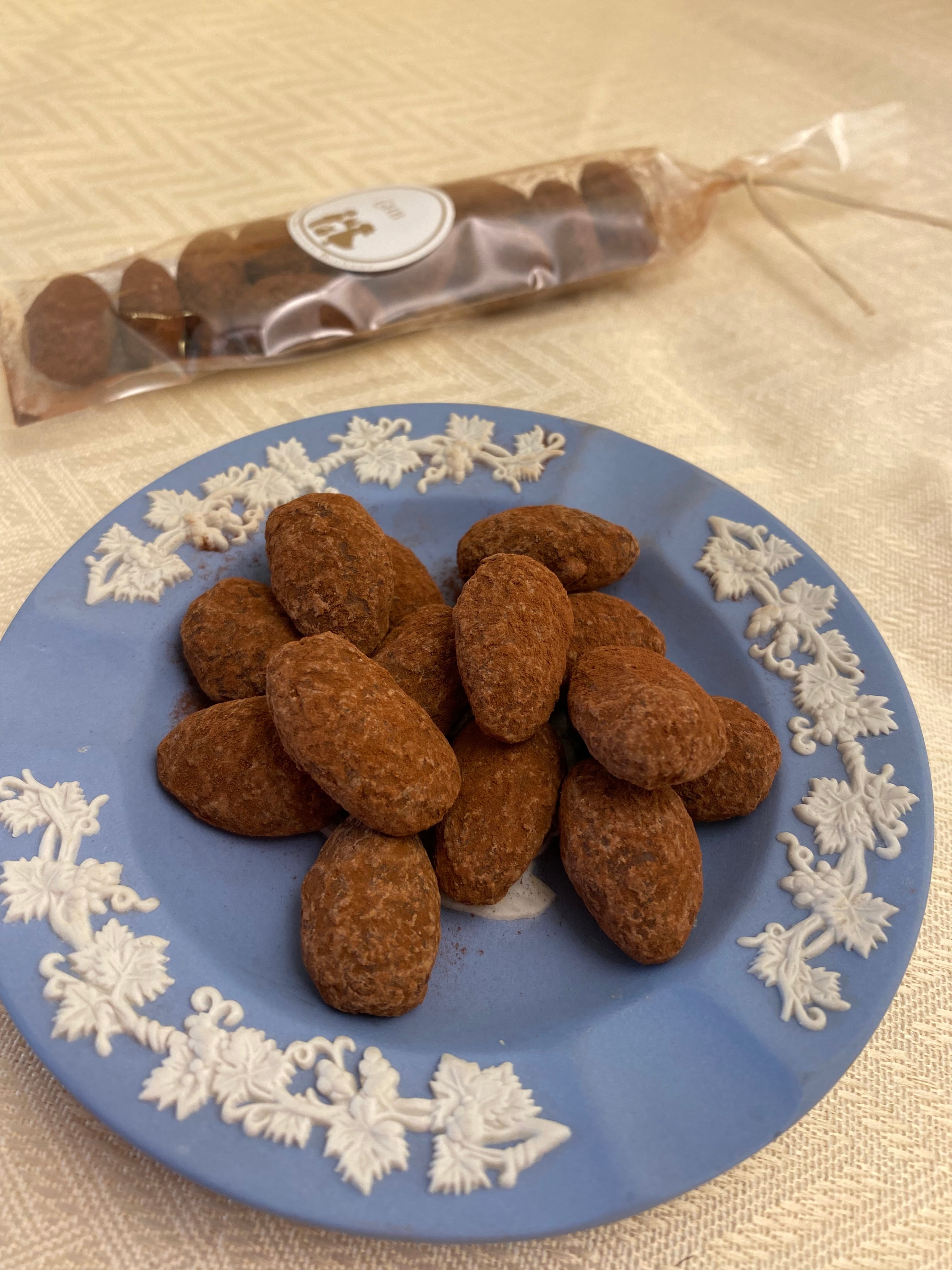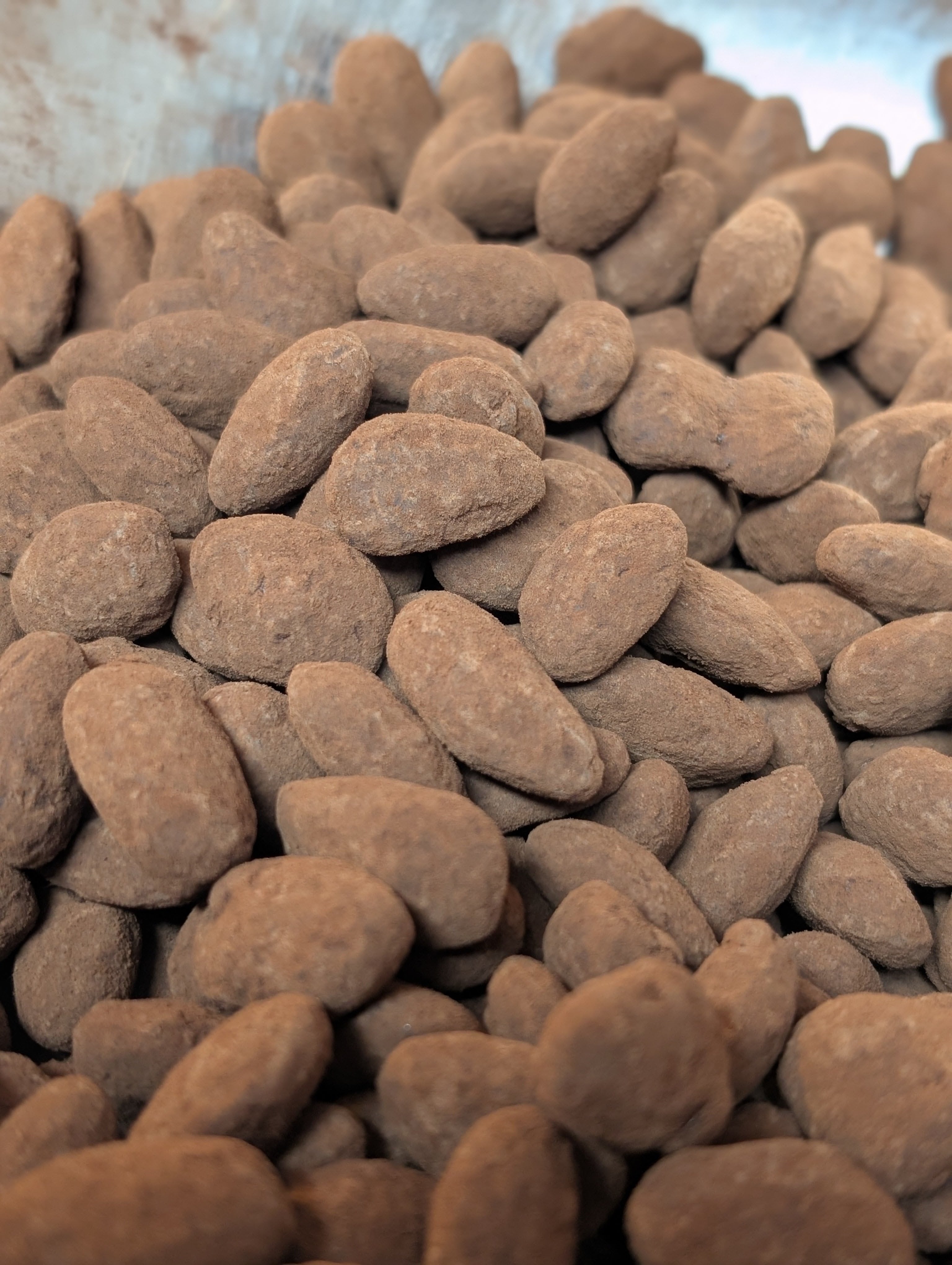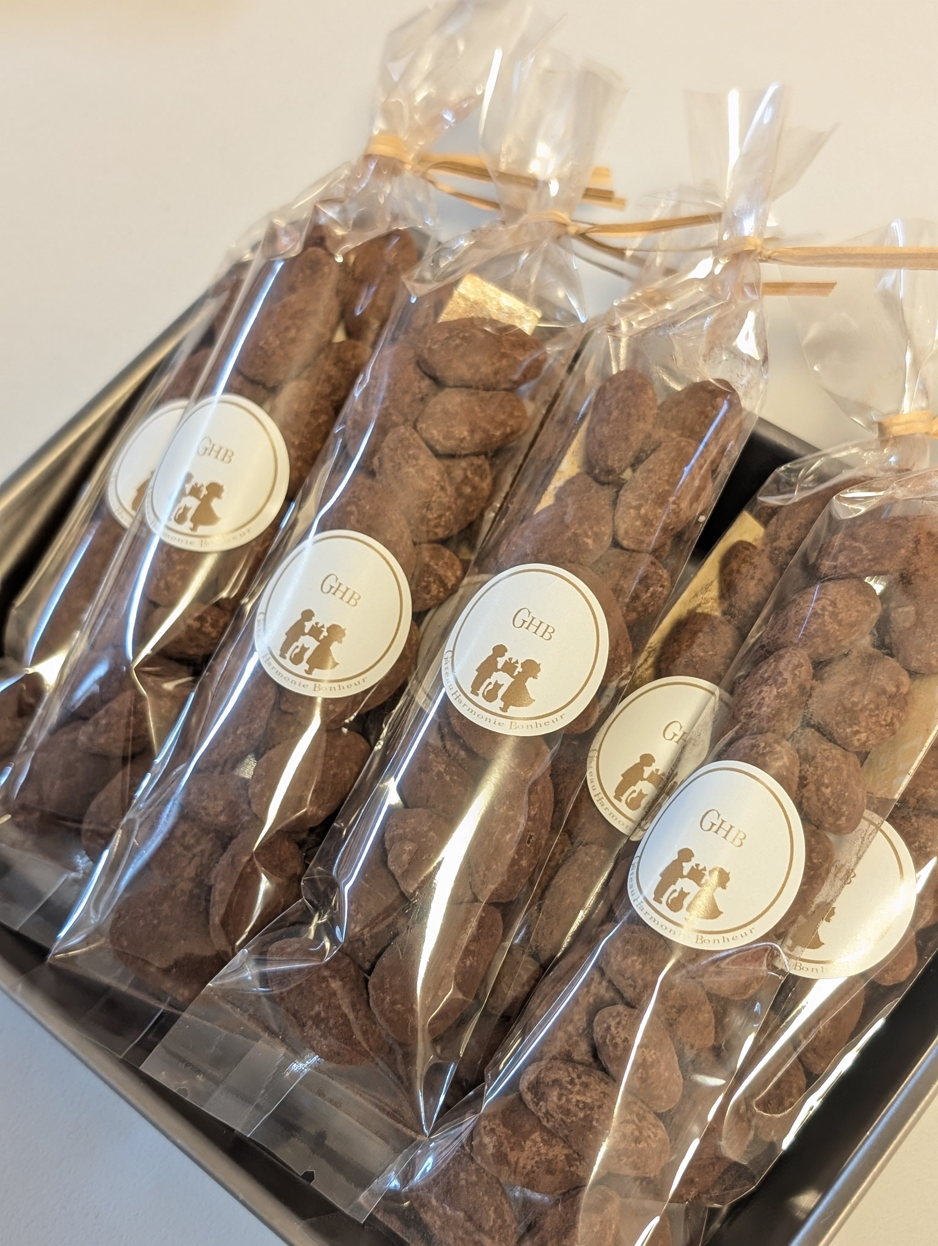 香ばしくローストしたアーモンドを、てんさい糖で丁寧にキャラメリゼし、フランス産ビターチョコレートとカカオパウダーでコーティング。